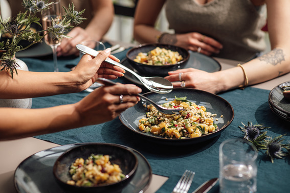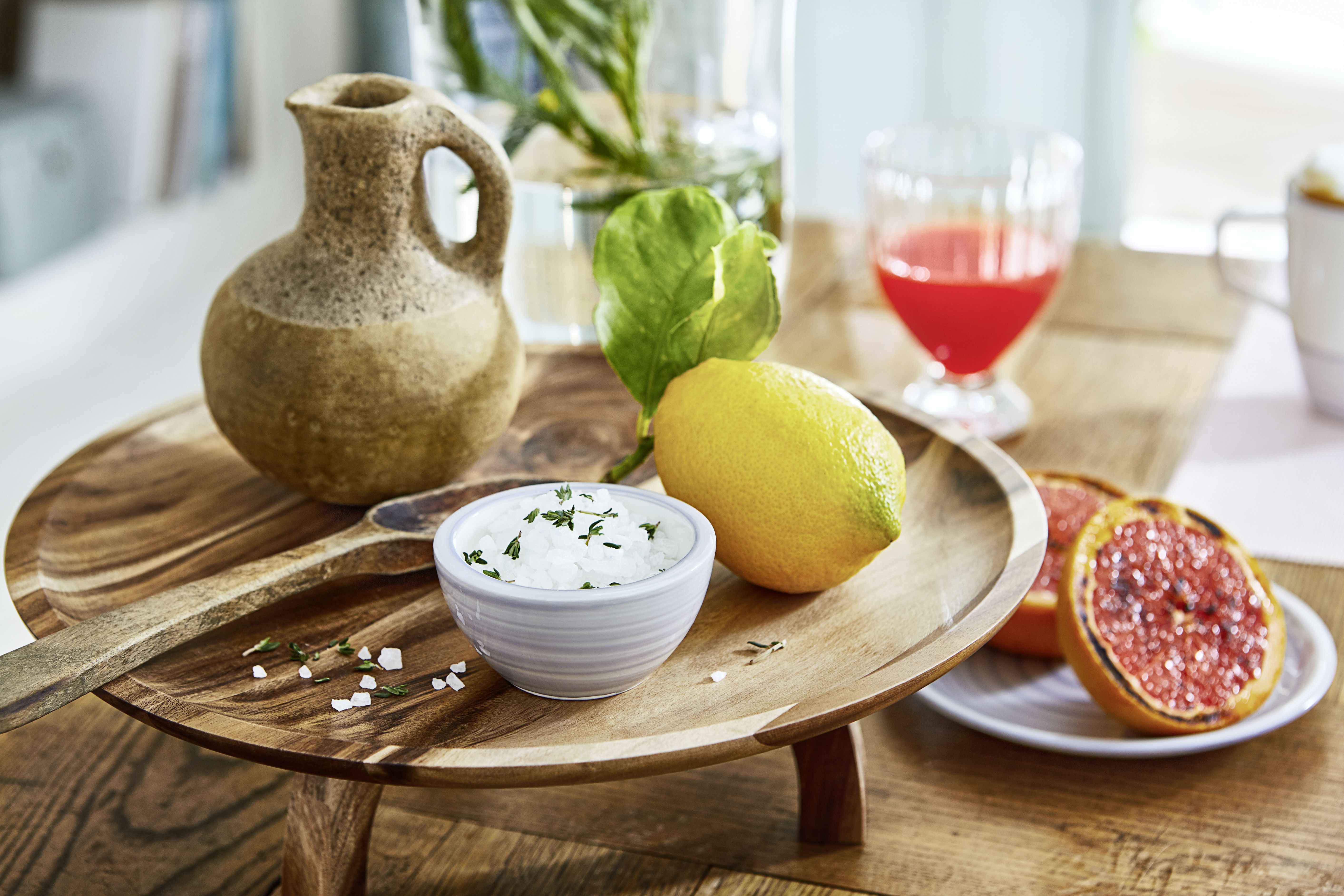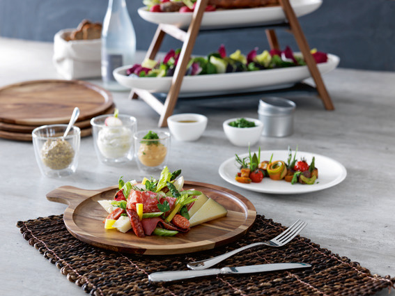 “A luxe menu deserves sophisticated utensils, like this [NewWave] flatware with a subtle twist detail in each handle. Made of 18/10 stainless steel, these pieces have lasting power. Pile crowd-pleasing salumi, cheese, and veggies on this Tuscan-farmhouse style [Artesano Original] acacia wood plate and wait for your guests to oooh and ahhh.”